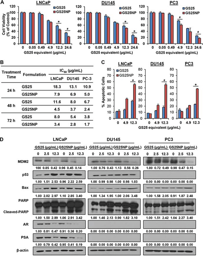 Figure 3: In vitro cytotoxicity of GS25 and GS25NP. LNCaP, DU145, and PC3 cells were exposed to various concentrations of GS25 and GS25NP for 24, 48, or 72 h for determination of A. the cell viability (24 h) and B. IC50 values. The same cell lines were exposed to various concentrations of GS25 and GS25NP for C. 48 h for the determination of cell apoptosis, which was evaluated by the Annexin V-FITC method and D. for 24 h to determine the expression levels of various proteins by Western blotting. The intensity ratio under each band was obtained by IMAGEJ software analysis normalized on untreated control. The concentration unit for GS25NP is GS25 equivalent in all experiments and all experiments were repeated three times. (*P < 0.05 and #P < 0.01).