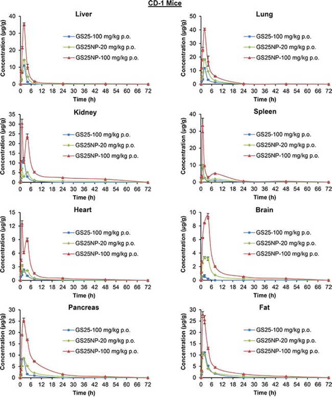 Figure 5: Tissue biodistribution of GS25 and GS25NP. The time-dependent distribution of GS25 and GS25NP in various tissues (liver, lungs, kidneys, spleen, heart, brain, pancreas, and fat) of CD-1 mice after an oral dose of 100 mg/kg of GS25, 20 mg/kg of GS25NP, or 100 mg/kg of GS25NP. The concentration unit for GS25NP is GS25 equivalent in all experiments.