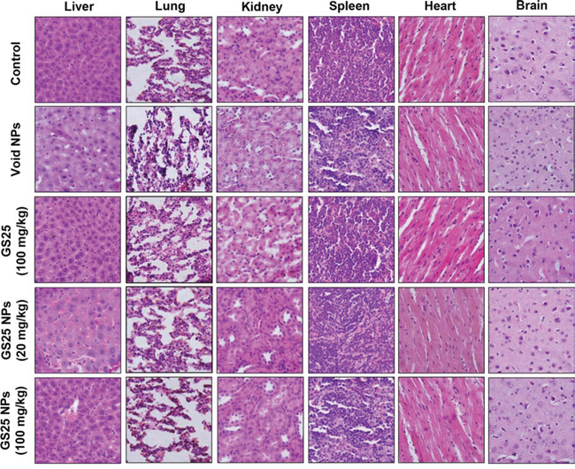 To determine the optimal therapeutic doses of GS25 and GS25NP for in vivo efficacy studies, initial maximum tolerated dose (MTD) studies were performed in CD-1 mice. The results showed no toxicity to the mice at a dose of up to 400 mg/kg of GS25 or GS25NP. No significant decrease in mouse body weight or any other signs of toxicity were observed. Further, a histological examination of the various tissues (liver, lungs, kidneys, spleen, heart, and brain) from mice treated with the vehicle, GS25, or GS25NP showed no significant differences among the groups (Figure 7).