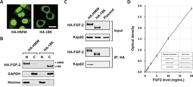 Figure 1: HMW FGF2 localizes in the nucleus and associates with Kapβ2. A. T98G cells transfected with the two HA-FGF2 isoforms (HA-HMW and HA-18K) were immunostained by HA antibody. Scale bar 10 μm. B. Nuclear and cytosolic fractionation of T98G cells transfected with HA-FGF2 isoforms (HA-HMW and HA-18K) were subjected to western blot analysis using HA antibody. GAPDH and Histone H3 were used as marker for cytosolic (C) and nuclear (N) fractions respectively. C. Whole cell lysates were extracted from T98G cells transfected with either HA-HMW or HA-18K, as well as plasmid control, and subjected to immunoprecipitation with HA antibody, followed by western blot analysis using antibodies against HA and Kapβ2. Top panels: input; bottom panels: IP. D. Levels of FGF2 in the media of indicated experimental groups were measured using ELISA by plotting to curve of known FGF2 concentrations. Data are shown as mean ± SEM of three independent experiments. n.s. not significant vs empty vector.