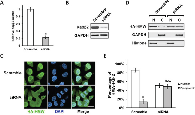 Figure 2: Kapβ2 is required for efficient nuclear translocation of HMW FGF2. A and B. T98G cells were transfected with scramble siRNA and siRNA against Kapβ2 mRNA. Kapβ2 mRNA and protein levels were examined with RT-PCR (A) and western blot (B) respectively. Data are shown as mean ± SEM of three independent experiments; *P < 0.05 versus control. C. T98G cells expressing HMW FGF2 (HA-HMW) were transfected with scramble siRNA or siRNA against Kapβ2, and subjected to immunostaining by HA antibody (green). Nuclei were stained by DAPI (blue). Scale bar 10 μm. D. T98G cells expressing HMW FGF2 were transfected with scramble siRNA or siRNA against Kapβ2, and subjected to fractionation. Nuclear (N) and cytosolic (C) fractions were analyzed by western blot using antibodies against HA to examine the subcellular distribution of HMW FGF2 protein. GAPDH and Histone H3 were used as marker for cytosolic (C) and nuclear (N) fractions respectively. E. Quantifications of the fluorescence signal of HMW-FGF2 in panel (C) Data are shown as mean ± SEM of three independent experiments; *P < 0.05 versus nuclear; n.s. not significant vs nuclear.