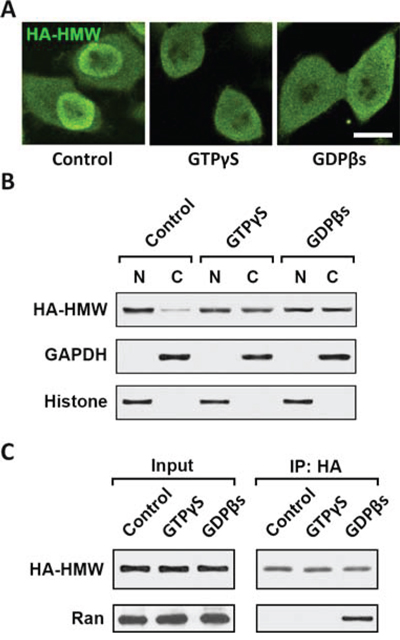 Figure 3: Nuclear translocation of HMW FGF2 requires Ran GTPase activity. A. T98G cells expressing HMW FGF2 were treated with 0.1 nM either GTPγS or GDPβs, as well as control, and subjected to immunostaining by HA antibody (green). Nuclei were stained by DAPI (blue). Scale bar 10 μm. B. T98G cells as treated in A were also subjected to fractionation. Nuclear (N) and cytosolic (C) fractions were analyzed by western blot using antibodies against HA to examine the subcellular distribution of HMW FGF2 protein. GAPDH and Histone H3 were used as marker for cytosolic (C) and nuclear (N) fractions respectively. C. Whole cell lysates were extracted from T98G cells as treated in A, and subjected to immunoprecipitation with HA antibody, followed by western blot analysis using antibodies against HA and Ran.