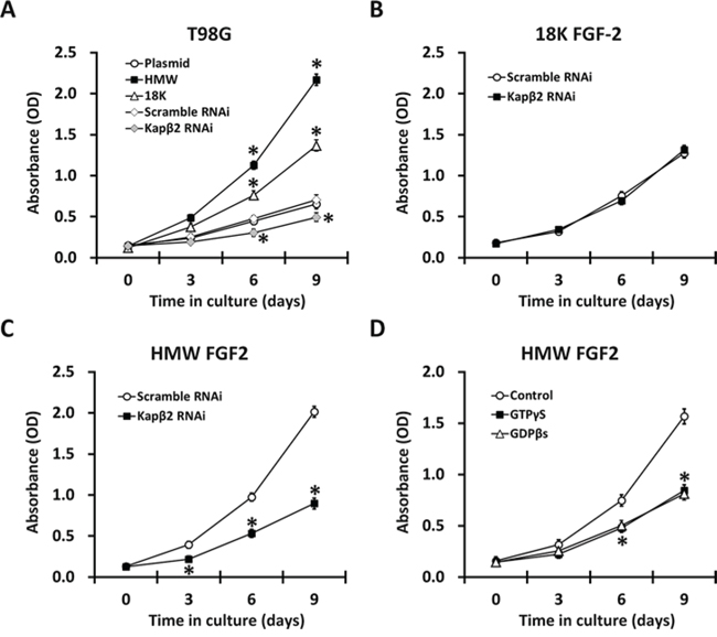 Figure 4: Proliferation of T98G cells expressing either HMW or 18K FGF2 subjected to RNAi against Kapβ2 (B and C) or GTPγS/GDPβs treatment (D) were measured by MTT assays. A. Growth of T98G cells expressing HMW FGF2, 18K FGF2 or empty plasmid, as well as subjected to RNAi against Kapβ2 vs scramble RNAi. B. Growth of T98G cells expressing 18K FGF2 were subjected to RNAi against Kapβ2 vs scramble RNAi. C. Growth of T98G cells expressing HMW FGF2 were subjected to RNAi against Kapβ2 vs scramble RNAi. D. Growth of T98G cells expressing HMW FGF2 were treated with GTPγS or GDPβs as well as control treatment. Data are shown as mean ± SEM of three independent experiments; *P < 0.05 versus respective control.