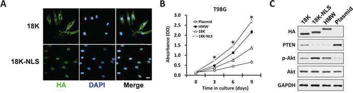 Figure 6: Forcing 18K FGF2 into the nucleus with classical NLS. A. T98G cells transfected with either 18K or 18K-NLS FGF2 were immunostained by HA antibody (green). Nuclei were stained by DAPI (blue). Scale bar 10 μm. B. T98G cells transfected with HMW, 18K, 18K-NLS FGF2 or empty plasmid were subjected to MTT assay. Data are shown as mean ± SEM of three independent experiments; *P < 0.05 18K-NLS versus 18K and HMW. C. Whole cell lysates were collected from T98G cells as in B, followed by western blot analysis using antibodies against HA, PTEN, Akt and phosphorylated Akt (p-Akt). GAPDH was used as loading control. Notice the slight shift in mobility in HA-18K-FGF2 caused by the NLS.
