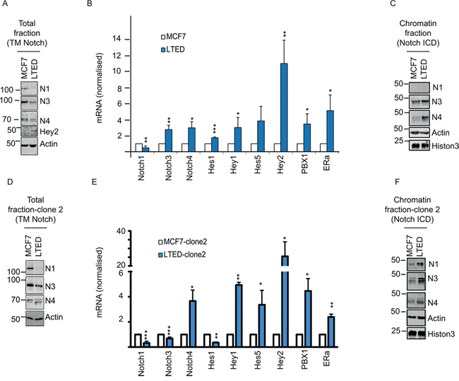 We have previously shown that Notch signalling plays a significant role in the development of endocrine therapy resistance [18, 19, 29, 30]. Notch signalling is partly dependent on the absolute amounts of Notch receptors present in the cells. However, there is substantial debate on the importance of different Notch receptors in endocrine resistance (reviewed in [31]). We reasoned that the rate of Notch activation, via its cleavage, is equally important to downstream signalling controlling tumor cell growth and survival. To test this, we first quantified total Notch levels using two isogenic cell lines: MCF7 and long-term estrogen deprived (LTED). The latter were derived from MCF7 following one year estrogen withdrawal to mimic endocrine therapy resistant breast cancer [28]. Notably, we find that all the receptors are downregulated at the protein level (Figure 1A). Notch1 is also downregulated at the mRNA level, whereas Notch3 and Notch4 mRNA levels are not (Figure 1B). Paradoxically, LTED cells contain higher protein levels of the Notch target Hey2, a well-characterized estrogen target gene [32] suggesting that receptor levels alone could not accurately predict Notch signalling (Figure 1A). LTED cells have impaired ERα signalling as a consequence of estradiol starvation, thus suggesting that Hey2 may be uniquely regulated by Notch in endocrine therapy resistant cells. Furthermore, we find that numerous additional Notch targets are also transcriptionally upregulated in LTED cells despite a general reduction in Notch receptor (Figure 1B). The discrepancy between total Notch protein levels and Notch target genes might be explained by hyper-activated Notch signalling via increased cleavage rates. To test this hypothesis, we measured Notch ICDs by chromatin fractionation and western blot, using ICD specific antibodies, which were designed and fully characterised in house (Supplementary Figure S1A–1B). Interestingly, we find that the LTED chromatin fraction presents greater enrichment for the Notch3 and Notch4 ICDs (Figure 1C). Importantly, we also screened a second LTED model, derived in a different lab (LTED clone 2) [10]. We confirmed that the total amount of Notch is dowregulated at protein level (Figure 1D) whereas Notch ICDs are upregulated in the chromatin fraction (Figure 1F). We also find Notch target genes are transcriptionally upregulated in the second clone (Figure 1E) thus confirming hyper-activated Notch signalling in endocrine therapy resistant cells.