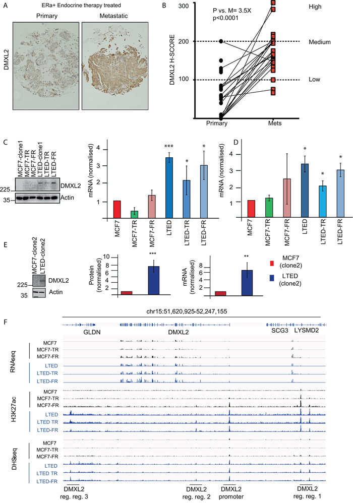 Figure 2: DMXL2 is overexpressed in metastatic tumors resistant to endocrine therapy. A. Primary and matched Metastatic samples were processed using DMXL2 IHC B. H scores were plotted. Pair-wise T-test between the average score (3 independent scorers, duplicate sections) was used to establish significance. DMXL2 is overexpressed in ETR cells and it is epigenetically activated. C. Representative western blot showing DMXL2 is overexpressed in LTED resistant cells. Graph shows protein normalised to loading control (Actin). q(RT) PCR mRNA levels normalised to 28S. In (C) cells were cultured as described in material and methods. In D. cells were cultured in MCF7 media (3 days). (*) P < 0.05 (**) P < 0.01 (***) P < 0.001 E. Different clone of MCF7 and LTED showing DMXL2 upregulation. F. Snapshots from DNaseI hypersensitivity site (DHS-seq) and Chip-seq for K27ac histone mark near DMXL2 promoter across all 6 breast cancer cell models. Chip-seq tracks display the active regulatory elements near DMXL2 promoter are uniquely found in estrogen deprived cell lines (LTED cells), indicating the activation of DMXL2 gene in LTED cells, but not MCF7 cells.