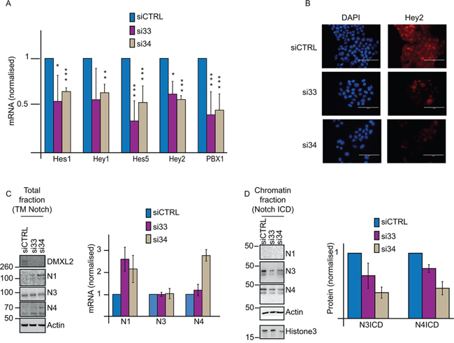 Figure 3: DMXL2 regulates Notch pathway. A. q(RT) PCR mRNA levels of Notch targets following DMXL2 depletion B. Representative immunofluorescence images of Hey2 following siDMXL2 showing Hey2 nuclear signal was impaired. Bars represent 400 uM C. Representative western blot showing reported TM Notch accumulates following DMXL2 depletion. Antibodies were used as in 1A D. Representative blot showing Notch3 and 4ICD reduced chromatin accumulation following siDMXL2. Antibodies were used as in 2C. Knock down was performed for 48 or 72 hrs (for mRNA or protein extraction respectively). (*) P < 0.05 (**) P < 0.01 (***) P < 0.001. Every experiment is an average of three independent experiments. Bars represent standard deviation.