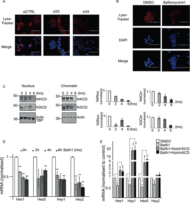 DMXL2 has been described as a regulator of the V-ATPase pump in drosophila and mammalian systems. Furthermore, there is a growing body of evidence linking oncogenic Notch signalling to V-ATPase pump in mammals. [23, 34, 35]. First, we wanted to confirm that DMXL2 is required for V-ATPase activity. To do so, we performed DMXL2 depletion and measured pH by Lysotracker staining [36]. As expected, LTED cells depleted for DMXL2 show reduced Lysotracker staining confirming that DMXL2 is a pump regulator (Figure 4A). To directly inhibit the pump, we employed Bafilomycin A1 [37] and measured pH changes in the intracellular compartment. Bafilomycin A1 disrupts V-ATPase function, as shown by the reduction in Lysotracker staining (Figure 4B). These experiments were performed using 125 nM Bafilomycin A1, a dose that does not affect cell proliferation (data not shown). To confirm that Notch signalling is dependent on the V-ATPase activity in endocrine therapy resistant breast cancer cells, we monitored Notch intracellular domain (NICD) accumulation into the chromatin following Bafilomycin A1 treatment. We demonstrate that Notch3 and 4-ICD stop accumulating in the nucleus in a time dependent manner following Bafilomycin A1 treatment (Figure 4C) mirroring the effect of DMXL2 depletion (Figure 3D). In agreement, Notch targets are transcriptionally silenced at the same rate (Figure 4D). To further confirm that DMXL2 is upstream of Notch signalling, we performed a rescue experiment. We used Bafilomycin A1 to down-regulated Notch targets and then over-expressed Notch3 and Notch4ICDs. Notably, we were able to completely rescue their expression (Figure 4E). Overall, these data strongly suggest that increased Notch signalling in LTED is linked to V-ATPase acidification and that this is likely to be mediated by DMXL2 overexpression.