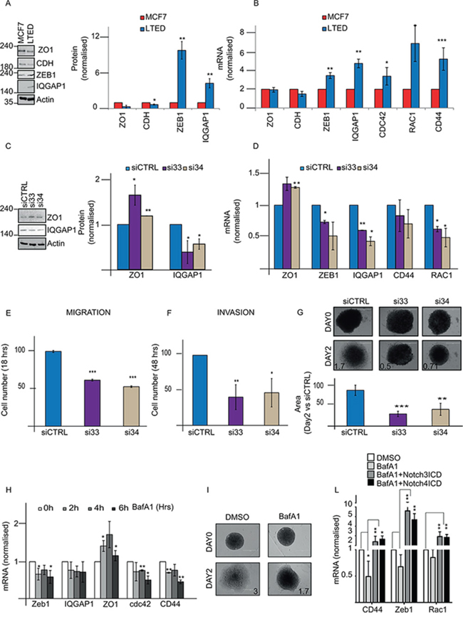 Figure 5: DMXL2 regulates mesenchymal switch in LTED cells. A. Representative western blot showing EMT targets genes in LTED cells compared to MCF7 B. q(RT) PCR mRNA levels of EMT targets normalised to 28S C. Representative western blot showing regulation of EMT genes following DMXL2 knock down D. q(RT) PCR mRNA of EMT genes after siDMXL2 E, F. Knock down was performed on 6 well plate for 24/48 hours. Cells were harvested and counted. 40,000 were seeded on 16 wells ECM plates with/without matrigel (for invasion and migration respectively) and left migrating or invading for 48/24 hours respectively. The graphs represent the difference in cell number compared to siControl G. 3D Invasion assay organoids. Representative pictures of organoids embedded in matrigel after 5 days knock down (performed during the hanging time) at day 0 and 2. The graph represents the difference in the area between day 0 (cells just embedded) and day 2 (cells left invading. Bars represent 400 uM. H. Bafilomycin A1 impairs cell invasion. Cells were treated as in 4C. qRT-PCR mRNA for EMT genes is shown. I. Representative pictures of organoids. Medium containing 500 pM BafA1 was added to the medium for 48 hours after embedding the organoids in matrigel. Day 0 and day 2 images are shown. L. EMT targets are rescued by ectopic expression of Notch ICD. Cells were pre-treated for 6 hrs with 500 pM of BafA1 followed by 24 hours Notch ICD over-expression. Every experiment is an average of three independent experiments. Bars represent standard deviation (*) P < 0.05 (**) P < 0.01 (***) P < 0.001.