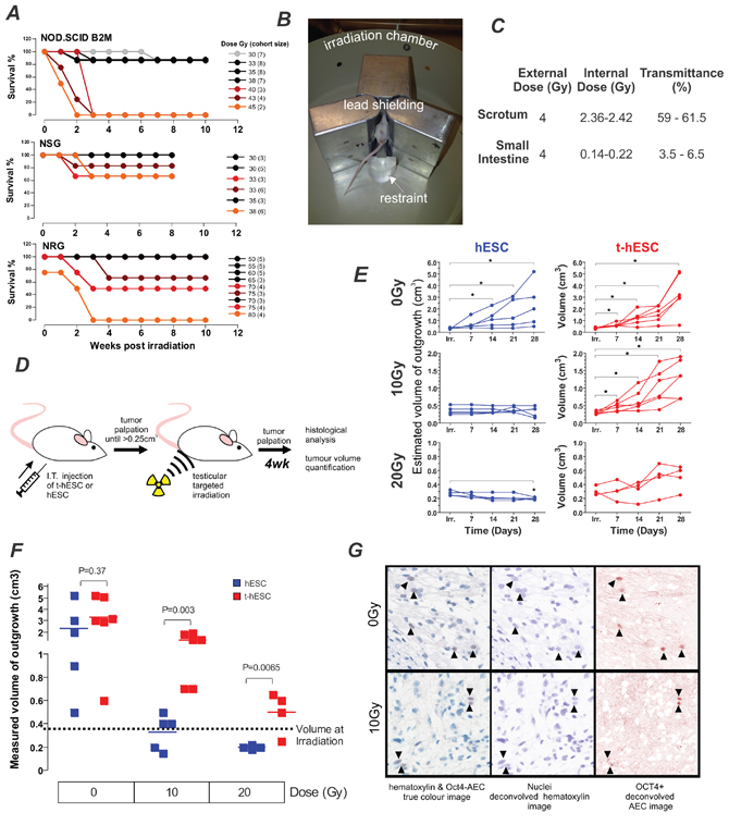 Figure 1: t-hESC derived tumours are radiation resistant compared with their normal counterpart. A. Comparison of mouse survival for three stains of immunocompromised mice NOD/SCID, NOD/SCID Il2γ-/- (NSG) and NOD Rag1-/- Il2rγ-/- (NRG), used to quantify xenotransplantation post whole body irradiation illustrating relative tolerance to irradiation. Each line represents a separate cohort of mice. Legend describes radiation dose and the number of mice per cohort in parentheses. B. Overview of shielding apparatus for targeted irradiation highlighting irradiation chamber, lead shielding and restraint. C. Internal dose mice received while in shielding-apparatus measured using thermos-luminescence dosimeter (TLD) chips demonstrating effective shielding of body cavity by shielding apparatus (n = 3). D. Schematic of experimental design to initiate, radiate and quantify testicular tumours. E. Outgrowth (teratocarcinoma from t-hESC or teratoma from hESC) volumes estimated via weekly palpation show no increase in those derived from hESC following either 10 or 20Gy doses gamma-radiation (each series represents 1 mouse). F. Final outgrowth (teratocarcinoma from t-hESC or teratoma from hESC) volume was quantified by displacement 4 weeks post irradiation show significantly larger tumours derived from t-hESC compared to hESC. G. Immuno-staining post-harvest identified OCT4+ cells in both non-irradiated and 10Gy irradiated teratocarcinoma derived from t-hESCs. Colour deconvolution of the images allowed better visualization of OCT4-positive cells.