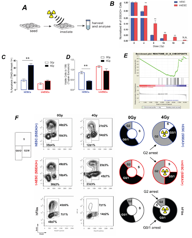 Figure 2: In vivo radiation resistance of t-hESC is recapitulated in vivo and results in G2 arrest. A. Schematic of experimental design for characterisation in vitro radiation response. B. Total SSEA3+ cell count 72 hours post irradiation of hESC and t-hESC cultures over a range of doses reveals a greater decrease in the number of SSEA3+ hESC relative to t-hESCs at all doses of radiation (n = 3). C. Relative percentages of cells in early apoptosis (7AAD-, Annexin V +) show an increase in the induction of apoptosis in hESC (SSEA3+) cells relative to t-hESC (SSEA3+) cells (P < 0.01, n = 4) 8 hours after exposure to a 4 Gy dose of γ. D. Relative number of viable hESC and t-hESC cells 8 hours after exposure to a 4 Gy dose of γ irradiation measured via trypan blue shows an increase in cell death in hESC cells relative to t-hESC cells (**, P < 0.01, n = 4). E. GSEA of G2-M checkpoint genes show an enrichment in hESC vs t-hESC. F. Flow cytometric quantification of cell cycle through 7AAD staining (DNA) and BrdU incorporation 12 h post-irradiation for SSEA3+ h-ESC, SSEA3+ t-hESC and fibroblasts. Both hESC and t-hESC preferentially arrest in G2 while fibroblasts arrest predominately in G1/0 and to a lesser extent in G2 although hESC show a significantly greater frequency of cells in G2 (p < 0.01, n = 4).