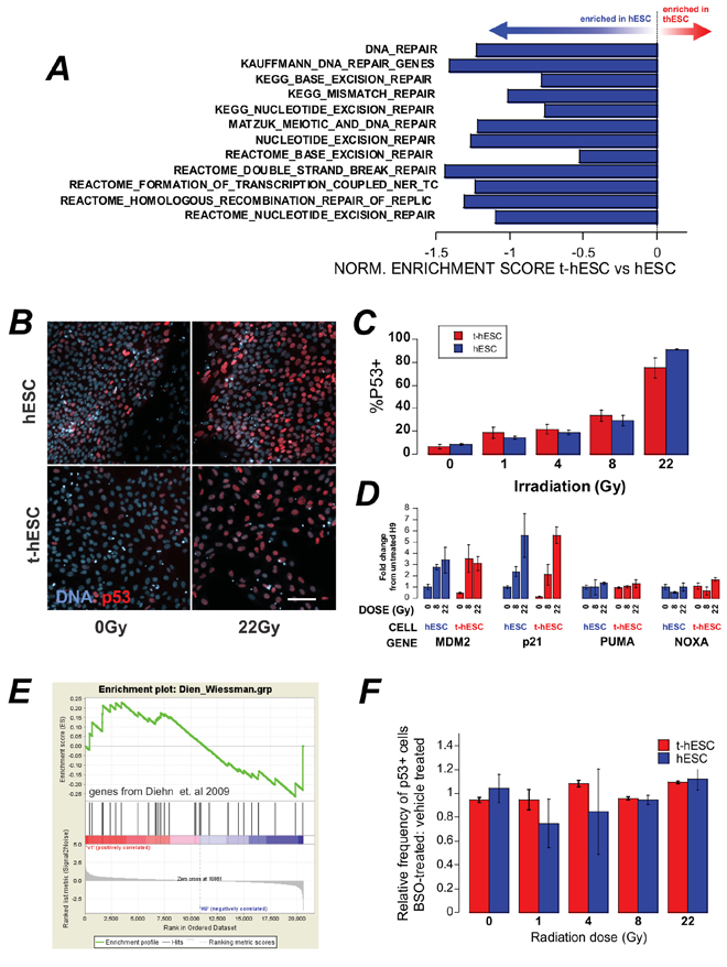 Figure 3: A. GSEA of a number of genesets related to DNA repair show an enrichment in hESC over t-hESC. B. In situ staining of p53 in hESC and t-hESC post-irradiation. C. Quantification of the increase in p53 positivity in reponse to increasing doses of radiation showed no significant difference between t-hESC and hESC (means ± sem, N = 2, n = 3). D. qPCR analysis of transcriptional targets of p53 8 hr post irradiation. E. GSEA of genes implicated in reactive-oxygen species processing in radio-resistant breast-cancer stem cells over bulk tumour cells shows no enrichment between t-hESC and hESC. F. t-hESC were pre-incubated with 1 mM BSO to reduce the ROS-buffering capacity of the cells for 24 hrs prior to irradiation with increasing doses of gamma radiation. The frequency of p53 positive cells was unaffected. Means ± sem, n = 3.