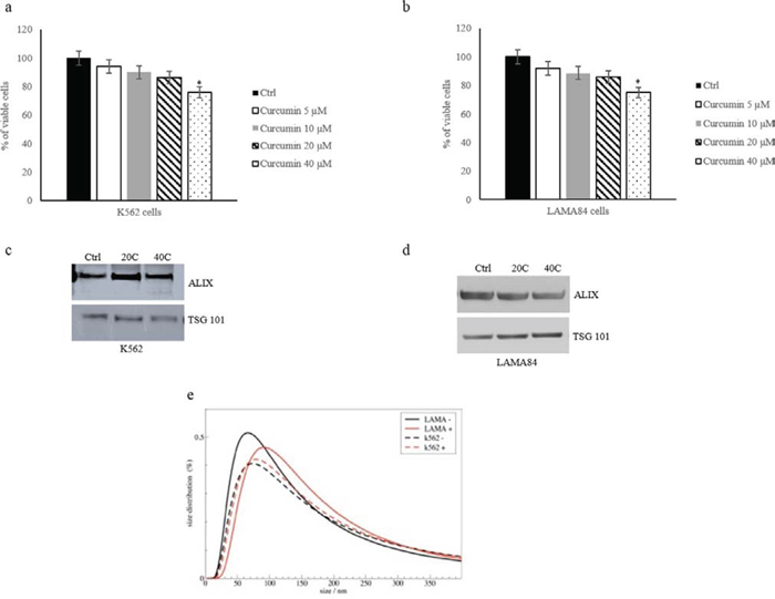 Figure 1: K562 a. and LAMA84 b. cell viability was measured by MTT assay after 24 h of treatment with Curcumin (5–10-20–40 μM). The values were plotted as a percentage of viable cells. Each point represents the mean ± SD of three independent experiments, *p ≤ 0.05. Detection of Alix and TSG101 in 30 μg of exosomes purified from conditioned medium of K562 c. and LAMA84 d. cells treated with 20–40 μM of Curcumin. e. Dynamic light scattering (DLS) analysis of exosomes released by K562 and LAMA84 control (−) and treated with 20 μM of Curcumin (+).