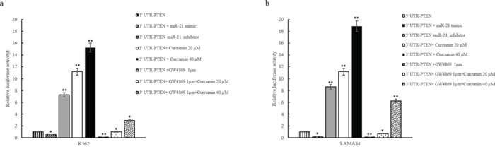 Figure 3: Luciferase activity of K562 a. and LAMA84 b. cells transfected with reporter plasmid (PTEN-pEZX) and treated with 20 and 40 μM of Curcumin and/or GW4869 1 μM, for 24 hours. K562 (a) and LAMA84 (b) cells transfected with PTEN-pEZX were also contrasfected with miR-21 inhibitor or miR-21 mimic. Values are the mean ± SD of 2 independent experiments *p ≤ 0.05, **p ≤ 0.01.