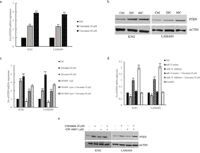 Figure 4: a. PTEN expression in K562 and LAMA84 cells treated for 24 hours, with 20 and 40 μM of Curcumin, was determined by quantitative real time PCR analysis. b. Western blot analysis of PTEN in K562 and LAMA84 cells treated with 20 and 40 μM of Curcumin, for 24 hours. Actin was used as loading control. c. PTEN expression in K562 and LAMA84 cells treated with 20 and 40 μM of Curcumin and/or GW4869 1 μM, for 24 hours, was determined by quantitative real time PCR analysis. d. PTEN expression in K562 and LAMA84 cells transfected with miR-21 mimic, miR-21 inhibitor, treated or not with 20 μM Curcumin, or scramble was determined by quantitative real time PCR analysis. Values are the mean ± SD of 3 independent experiments *p ≤ 0.05, **p ≤ 0.01. e. Western blot analysis of PTEN in K562 and LAMA84 cells treated with 20 μM of Curcumin and/or GW4869 1 μM, for 24 hours. Actin was used as loading control.