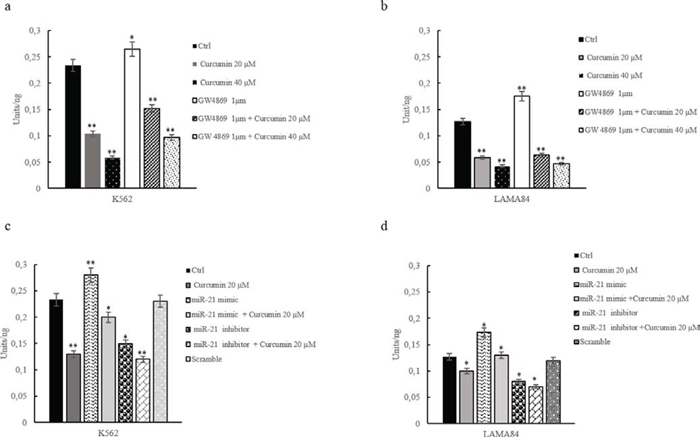 Figure 5: AKT phosphorylation, assessed by ELISA, in K562 a. and LAMA84 b. cells treated with 20 and 40 μM of Curcumin and/or GW4869, for 24 hours. AKT phosphorylation, assessed by ELISA, in K562 c. and LAMA84 d. cells transfected with miR-21 mimic, miR-21 inhibitor or scramble and/or treated with 20 μM of Curcumin. Values are the mean ± SD of 2 independent experiments *p ≤ 0.05, **p ≤ 0.01.