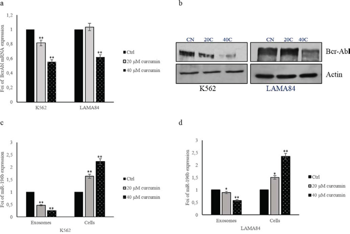 Figure 8: a. Bcr-Abl expression in K562 and LAMA84 cells treated with 20 and 40 μM of Curcumin, for 24 hours, was determined by quantitative real time PCR analysis. b. Western blot analysis of Bcr-Abl in K562 and LAMA84 cells treated with 20 and 40 μM of Curcumin, for 24 hours. Actin was used as loading control. MiR-196b levels in K562 c. and LAMA84 d. cells and their released exosomes after treatment with 20 and 40 μM of Curcumin, for 24 hours, were determined by quantitative real time PCR analysis. Values are the mean ± SD of 3 independent experiments *p ≤ 0.05, **p ≤ 0.01.