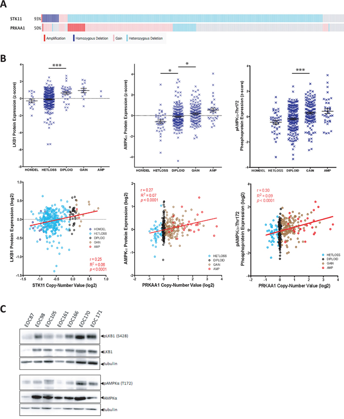 Figure 1: LKB1 and AMPKα expression in ovarian tumours. A. Oncoprint analysis of copy number at the STK11 and PRKAA1 gene loci are depicted for 311 ovarian serous cystadenocarcinoma tumours obtained using the provisional TCGA dataset from cBioPortal. Amplification (red), copy number gain (pink), heterozygous deletion (light blue) and homozygous deletion (dark blue) are shown. B. Top panels: LKB1, AMPKα and phospho-AMPKα (Thr172) protein expression data from 397 serous ovarian tumours as determined by RPPA analysis and obtained from the TCGA dataset. Protein expression z-score is plotted against copy number. One-way ANOVA with Tukey’s Multiple Comparison Test was performed (*, p < 0.05; ***, p < 0.001). Bottom panels: LKB1, AMPKα and p-AMPKα protein expression data was log2-transformed and plotted against log2-transformed gene copy number values. Pearson’s r correlation, goodness-of-fit R2, and p values are reported. C. Lysates were generated from flash-frozen ovarian tumour samples from seven patients and immunoblot was performed to examine p-LKB1 (S428), LKB1, p-AMPK α (T172), and AMPKα expression in these samples.