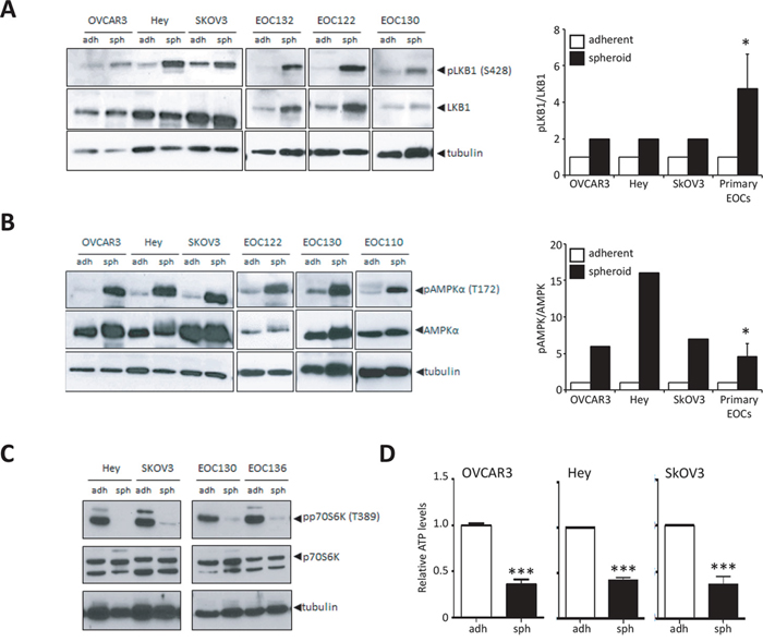 Figure 3: Increased LKB1-AMPK signalling activity in ovarian cancer spheroids. A. Immunoblot analysis of OVCAR3, Hey and SkOV3 cell lines and ascites-derived EOC cells to determine levels of p-LKB1 (Ser428) and LKB1 expression in cultures of adherent cells (adh) and 3-day spheroids (sph). Densitometry was performed on immunoblot data from cell lines and ascites-derived EOC cells (n = 16) to quantify change in p-LKB1 expression relative to LKB1. Data is represented as mean ± SEM and Student’s t-test for statistical significance (*, p < 0.05). B. Immunoblot analysis of OVCAR3, Hey and SkOV3 cell lines and ascites-derived EOC cells to determine levels of p-AMPKα (Thr172) and AMPKα expression in adherent cells (adh) and spheroids (sph). Densitometry was performed on immunoblot data from cell lines and ascites-derived EOC cells (n = 14) to quantify change in p-AMPKα expression relative to AMPKα. Data is represented as mean ± SEM and Student’s t-test for statistical significance (*, p < 0.05). C. Immunoblot analysis of Hey and SkOV3 cell lines and ascites-derived EOC cells to determine levels of p-p70S6K (Thr389) and p70S6K as a measure of mTORC1 activity. D. Quantification of intracellular ATP levels in SkOV3, Hey and OVCAR3 cell lines using luminescence-based ATP assay CellTiter Glo® cultured as adherent cells (adh) or spheroids (sph). Luminescence values were normalized to total protein in each sample. Data is represented as mean ± SEM and Student’s t-test for statistical significance (***, p < 0.001).