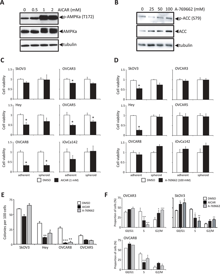 Figure 4: Stimulation of AMPK activity in proliferating ovarian cancer cells reduces growth and colony forming potential. A. Immunoblot analysis of p-AMPKα (Thr172) and AMPKα expression in Hey cells treated for 24 h with 0.5, 1 or 2 mM AICAR. B. Immunoblot analysis of p-ACC (Ser79) and ACC expression in Hey cells treated for 24 h with 25, 50 or 100 μM A-769662. C. Cell viability was determined following 3 d of AICAR (1 mM) treatment (black bar), or DMSO control (white bar) of six ovarian cancer cell lines cultured as adherent cells and spheroids. Data is represented as mean ± SEM and Student’s t-test for statistical significance (*, p < 0.05). D. Cell viability was determined following 3 d of A-769662 (100 μM) treatment (black bar), or DMSO control (white bar) of six ovarian cancer cell lines cultured as adherent cells and spheroids. Data is represented as mean ± SEM and Student’s t-test for statistical significance (*, p < 0.05). E. Clonogenic assays were performed by seeding ovarian cancer cell lines (1, 000 cells per well of 6-well dish) treating with 1 mM AICAR, 100 μM A-769662, or DMSO control for 3 d, followed by growth recovery in complete media. Data is represented as mean ± SEM and one-way ANOVA with Tukey’s Multiple Comparison test (*, p < 0.05; **, p < 0.01; ***, p < 0.001). F. Cell cycle analysis was performed by flow cytometry using BrdU and PI staining of OVCAR3, OVCAR8 and SkOV3 cells following 24 h of treatment with either 1 mM AICAR or 100 μM A-769662 (n = 2 for each cell line). Data is represented as proportion of cells in G0/G1, S and G2/M phases of the cell cycle. Data is represented as mean ± SEM and one-way ANOVA with Tukey’s Multiple Comparison test (*, p < 0.05; **, p < 0.01; ***, p < 0.001).