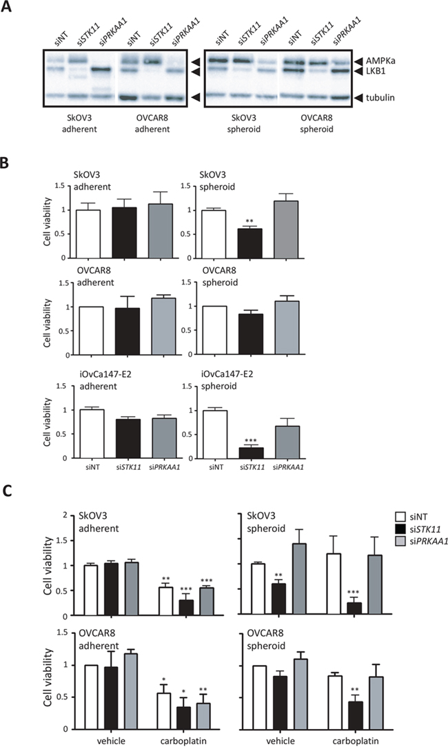 Figure 5: LKB1 expression is required to maintain cell viability and promote chemoresistance of ovarian cancer spheroids. A. Immunoblot analysis of LKB1 and AMPKα expression in ovarian cancer cells transfected with STK11 and PRKAA1 siRNA pools, or control siRNA (siNT). Expression was determined 72 h after transfection in adherent cells, or 72 h after cells were seeded to form spheroids. B. Cell viability was determined after 72 h using CellTiter-Glo® assay on siRNA-transfected SkOV3, OVCAR8 and iOvCa147-E2 cell lines cultured as adherent cells or spheroids. Data is represented as mean ± SEM and one-way ANOVA with Tukey’s Multiple Comparison test (*, p < 0.05; ***, p < 0.001). C. The experiment was performed as in (B), but where SkOV3 and OVCAR8 cell lines were treated with 50 μM carboplatin at 72 h post-transfection in adherent culture or at the time of seeding to 24-well ULA cluster plate to form spheroids. Cell viability was determined after 72 h using CellTiter-Glo® assay. Data is represented as mean ± SEM and one-way ANOVA with Tukey’s Multiple Comparison test (*, p < 0.05; **, p < 0.01; ***, p < 0.001).