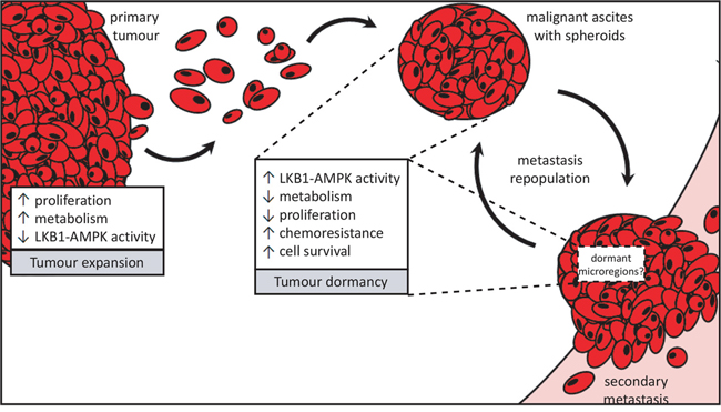 Figure 6: Proposed divergent roles for LKB1-AMPK signalling in metastatic ovarian cancer. Ovarian cancer metastasis occurs via direct dissemination of primary tumour cells into the peritoneal cavity. Single cells in suspension will readily undergo detachment-induced apoptosis, or anoikis, but the formation into multicellular aggregates called spheroids protects them from cell death. Spheroids possess an enhanced ability to reattach onto the serosal surfaces of peritoneal organs upon which the ovarian tumour cells make a “dormant-to-proliferative switch” and grow to establish secondary metastases. Rapidly-expanding tumour growth (whether in the primary tumour or metastases) would require reduced LKB1-AMPK signalling to allow for increased cell proliferation and anabolic metabolism. Spheroids, on the other hand, adopt a number of pathobiological changes which we propose contribute to their dormant phenotype and facilitate cell survival during metastatic transit in suspension. Our new results support the role for active LKB1-AMPK signalling contributing to ovarian cancer cell dormancy in spheroids by reducing energy metabolism and cell proliferation, yet promote cell survival and carboplatin-resistance in EOC spheroids.