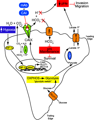 The switch to glycolysis by highly metabolically active tumor cells results in increased production and export of acidic metabolites, such as lactic and carbonic acids, to the extracellular space and leads to a decline in extracellular pH (pHe) [6], creating a toxic intratumoral microenvironment and providing a selective advantage for tumor cells that can survive these harsh conditions. One consequence of extracellular acidification is the disruption of the intracellular pH (pHi), a decrease in which rapidly affects basic cellular functions, including membrane integrity, metabolism and energy production, and proliferation [4, 6]. Thus, cells must regulate pHi as the extracellular pH declines, a process particularly critical for tumor cells that prefer a pHi that is somewhat more alkyline compared to that which is optimal for normal cells [4, 7]. The combination of an increasingly acidic intratumoral microenvironment and a requirement to regulate pHi results in the death of non-tumor cells and accelerates degradation of the extracellular matrix, thereby promoting the invasion and proliferation of acid-resistant cancer cells. As such, metabolic alterations induced by hypoxia can promote activities associated with aggressive tumor cell behavior, including survival, invasion and metastasis [8].
