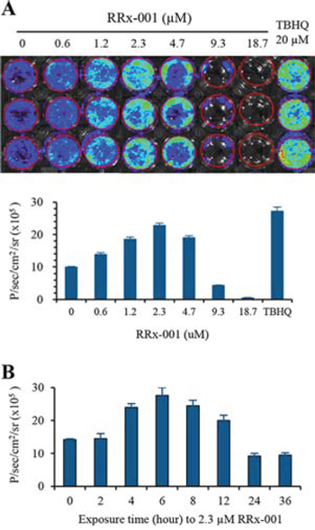 Figure 3: Reporter gene imaging to study the activation of ARE signaling by RRx-001 in SCC VII cells. A. Optical bioluminescence imaging and quantitative graph of ARE-FLUC signal in SCC VII cells stably expressing ARE-FLUC, 6 h after treatment with different doses of RRx-001. B. ARE-FLUC signal measured in SCC VII stable cells at different time points after treating with 2.3 μM of RRx-001.