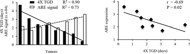 Data were statistically analyzed using a two-tailed Student’s t-test. The correlation between the tumor response to RRx-001 treatment and the level of ARE signal was analyzed by a linear regression analysis.