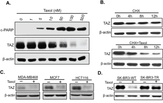 Figure 1: Taxol causes TAZ phosphorylation and degradation. A. HeLa cells were treated with Taxol at different concentrations (0, 1, 5, 10, 50, 100, or 500 nM) for 24 hours before cells were lysed for western blot to detect the apoptotic marker, cleaved-PARP (cPARP), and TAZ with related antibodies. β-actin was used as an internal loading control. B. Western blot analysis of TAZ turnover time after Taxol treatment. HeLa cells were treated with cycloheximide (CHX, 60 μg/ml) to block TAZ protein synthesis in the absence (–) or presence (+) of Taxol (100 nM). Cells were lysed at 0, 4, 8, or 12 h after drug treatments and subjected to western blot analysis of TAZ. C. TAZ is also phosphorylated and degraded in other cell lines. Breast cancer cell lines, MDA-MB468 and MCF7 as well as colon cancer cells HCT116 were treated with Taxol at 100 nM for 24 hours and floating cells were collected and lysed for western blotting to detect TAZ protein phosphorylation and degradation. D. Loss of TAZ degradation after Taxol treatment in drug resistant SK-BR3-TR cells. Cells were treated as described above. Wild-type SK-BR3 (SK-BR3-WT) as well as Taxol-resistant SK-BR3 cells (SK-BR3-TR) were cultured in the absence or presence of Taxol for 24 hours and TAZ levels were examined by western blot.
