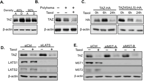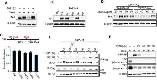 Since TAZ degradation is correlated with Taxol-induced apoptosis (Figure 1A), we investigated the relation between TAZ degradation and apoptosis. It is well-known that apoptosis results from activation of caspases [29]. Therefore, a pan-caspase/apoptosis inhibitor (Z-VAD) was used at different concentrations to treat cells together with Taxol. TAZ was still degraded when apoptosis was inhibited (Figure 6F), indicating that TAZ degradation is the cause (upstream mediator) rather than the result of Taxol-induced apoptosis.