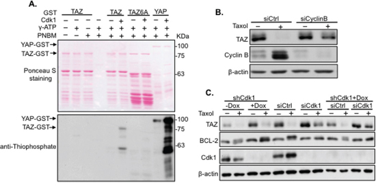 Figure 3: Taxol-induced TAZ phosphorylation and degradation is mediated by Cdk1. A. Phosphorylation of TAZ by Cdk1 In vitro. TAZ-GST or TAZ6A-GST was incubated with Cdk1 kinase, followed by in vitro kinase assay. YAP-GST was used as a positive control for Cdk1 kinase activity. Upper panel: ponceau S staining of fusion proteins on the membrane; Lower panel: western blot analysis of phosphorylated TAZ using SDS-PAGE gel and anti-thiophosphate antibody. B. Knockdown of Cyclin B blocks Taxol-induced TAZ degradation. Cyclin B was knocked down by siRNA in HeLa cells in the absence (–) or presence (+) of Taxol (100 nM) for 24 hours. Cells were lysed for western blot to detect TAZ expression. C. Knockdown of Cdk1 abolishes Taxol-induced Cdk1 degradation. Cdk1 was targeted with siCdk1, shCdk1 [inducible system with Doxycyclin (Dox) to induce shCdk1] and the combination of siCdk1 and shCdk1 in HeLa cells, and treated with Taxol (100 nM) for 24 hours. Cells were collected and lysed for western blot to detect TAZ expression. Since BCL-2 is a known substrate of Cdk1, BCL-2 was used as a control to check the efficiency of Cdk1 knocking down.