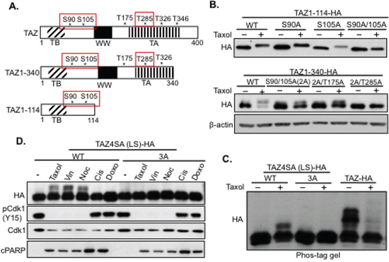 Figure 4: Mapping the Taxol-induced Cdk1 phosphorylation sites in TAZ. A. Schematic diagraph of TAZ functional domains and potential phosphorylation sites. TB, TEAD binding domain; WW, WW domain; TA, transactivating domain. S90, S105, and T285 are highlighted to indicate they are the phosphorylation sites causing band-shift after Taxol treatment for 6 h. B. Deletion and mutation analysis of TAZ phosphorylation. TAZ 1–114 and TAZ 1–340 deletions were used as templates to mutate the potential “S/T” phosphorylation sites into “A” singly or in combination. And these constructs were transfected into HeLa cells with Taxol treatment for 6 h to detect the sites responsible for Taxol-induced TAZ phosphorylation (band-shift on the gel) through running the floating (dead) cell lysates on western blot. C. Confirmation of Cdk1 phosphorylation sites by phos-tag gel. The three phosphorylation sites (S90, S105, and T285) identified with TAZ deletions (A, B) were further mutated into “A” (3A) on full length TAZ4SA (LS) (all 4 LATS phosphorylation sites are mutated). And this mutant [TAZ4SA (LS)+TAZ3A], TAZ4SA (LS) (WT) or wild-type TAZ was transfected into HeLa cells and treated with Taxol for 6 h. Then the lysates of floating cells were subjected to phos-tag gel to detect the potential extra phosphorylation sites, which only shift on phos-tag gel. Please note that phos-tag gel detects many LATS-phosphorylated TAZ proteins even without Taxol treatment. D. TAZ phosphorylation is specifically induced by antitubulin drugs. TAZ4SA (LS) (LATS phosphorylation site mutant) or TAZ4SA (LS)+3A (LATS phosphorylation site mutants plus 3A) were transfected into HeLa cells and treated with antitubulin drugs [Taxol, Vin (Vinblastine), Noc (Nocodazole)] at 100 nM as well as DNA damage reagents [20 μM Cis (Cisplatin) and 1 uM Doxo (Doxorubucin)] for 6 h. Phosphorylation of TAZ was detected with phos-tag gel, and Cdk1 activity was detected by checking phosphorylation on Y15 of Cdk1 (pCdk1-Y15). Apoptosis was determined by detecting cPARP expression.