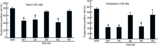 Figure 7: TAZ phosphorylation by Cdk1 sensitizes cells to antitubulin drugs. MCF10A cells stably expressing WPI vector, TAZ, or TAZ mutants (TAZ3A, TAZ3D, TAZ6A, or TAZ6D) were cultured in triplicate 12-well plate at 40% confluency before adding Taxol or Vinblastin at concentration of 100 nM. Cells were cultured for 48 hours with drugs added before subjected to Trypan blue exclusion assay. The experiments were repeated for three times and the average data and standard errors were calculated. * indicates the difference between WPI control and TAZ-WT or TAZ-3A or TAZ-6A mutants is statistically significant (p < 0.05).