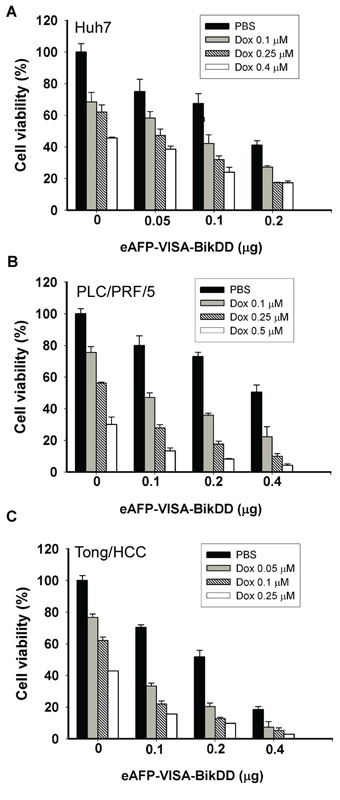 Figure 1: Cytotoxic effects of eAFP-VISA-BikDD plus Dox against human HCC cell lines in vitro. Huh7 A. PLC/PRF/5 B. and Tong/HCC C. cells were transfected with indicated concentrations of eAFP-VISA-BikDD by using extruding DOTAP:cholesterol liposomes. Transfection mixtures were removed after 4 hours, and fresh DMEM complete medium containing the indicated concentration of Dox was added for an additional 72 hours followed by cytotoxicity analysis by WST-1 assay. Relative cell viability was normalized to untreated cells (set as 100%) and expressed as mean ±SD.