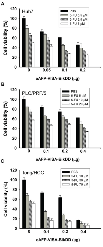 Figure 2: Cytotoxic effects of eAFP-VISA-BikDD plus 5-FU against human HCC cell lines in vitro. Huh7 A. PLC/PRF/5 B. and Tong/HCC C. cells were transfected for 4 hours with indicated concentrations of eAFP-VISA-BikDD by using extruding DOTAP:cholesterol liposomes. Transfection mixtures were removed after 4 hours, and fresh DMEM complete medium containing the indicated concentration of 5-FU was added for an additional 72 hours followed by cytotoxicity analysis by WST-1 assay. Relative cell viability was normalized to untreated cells (set as 100%) and expressed as mean ±SD.