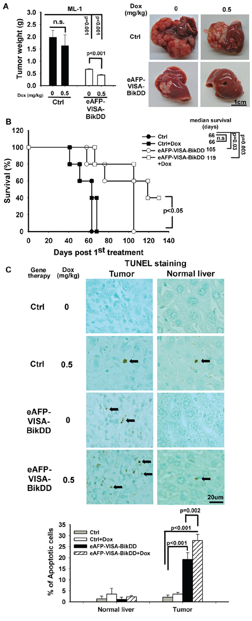 Figure 6: Antitumor effect of eAFP-VISA-BikDD combined with Dox in an orthotopic syngeneic mouse model. A. Left, ML-1 cells were orthotopically inoculated into the left liver lobe of BALB/c mice. One week after tumor inoculation, mice were randomly divided into four groups for treatment. Mice received systemic intravenous injection of control vector or eAFP-VISA-BikDD encapsulated in liposomes twice a week for four weeks. Dox (0.5 mg/kg) or normal saline was administered once a week by tail vein injection for four weeks. Thirty-seven days after initial treatment, mice were sacrificed and liver tumors were dissected and weighed. Data represent mean ±SEM. N = 5. Representative images of tumor tissues from mice after the indicated treatment are shown on the right. B. Survival rate of mice after the indicated treatment. n.s., not significant. C. Detection of apoptosis in liver tissues by TUNEL assays. Tissues collected from (A) were fixed with 10% neutral buffered formalin, and TUNEL-positive cells were stained and counted from four randomly selected fields per section. Arrows indicate TUNEL-positive apoptotic cells. Quantitation is shown below. Data represent mean ±SD.