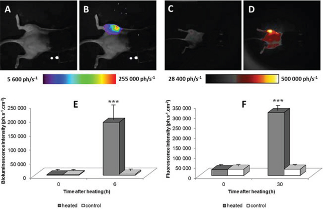Figure 1: Bioluminescence images of a representative chimera mouse engrafted with bone marrow from hsp-lucF mice before A. and 6 hours after B. heating (45°C for 8 min) in water bath the left tumor-bearing leg. Fluorescence images of a chimera mouse engrafted with bone marrow from hsp-lucF/hsp-mPlum mice before C. and 30 hours after heating D. The colour scales show the light intensity (photons.s−1.cm−2). Graphs represent measurement of bioluminescence E. (m +/− SD; n = 29) and fluorescent signals F. (m +/− SD; n = 5) before and after heating in heated and non-heated legs.