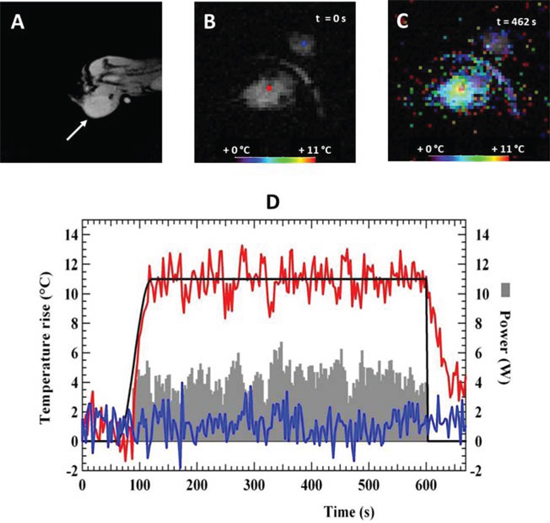 Figure 2: MRgHIFU heating of tumors in chimera mice showing MR T2 anatomical image A. of the tumor on the left leg of the mouse, MR temperature map before B. and at 462 s during heating C. Temperature map are color-coded and superimposed on anatomical MRI image of the tumor on the left. D. Representative time course of temperature and power evolution during a heating experiment showing target temperature (black line), measured temperature at the focal point (red line), measured temperature in an agar gel next to the mouse (blue line) and applied ultrasound power during the heating experiment (grey area).