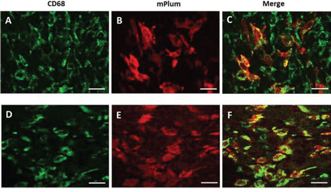Figure 5: Immuno-histochemical identification of mPlum expressing cells in tumor environment. Cells expressing CD68 marker (green label, A. & D.) and mPlum protein (red label, B. & E.) and merge images (C. & F.) 30 hours after tumor heating using water bath (A-C) or MRgHIFU (D-F). Bars represented 50 μm.