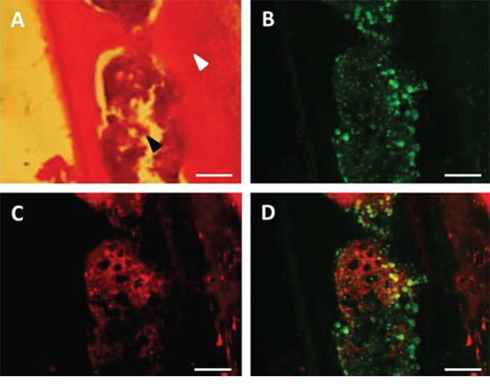 Figure 6: Immuno-histochemical identification of mPlum expressing bone marrow cells. Cells expressing CD68 marker (green label, B) and mPlum protein (red label, C) and merge images D. in bone cells after MRgHIFU heating. Hematoxylin and eosin staining of the same tibia sections A. allowed for discriminating between bone (white arrow) and bone marrow (black arrow). Bars represented 100 μm.