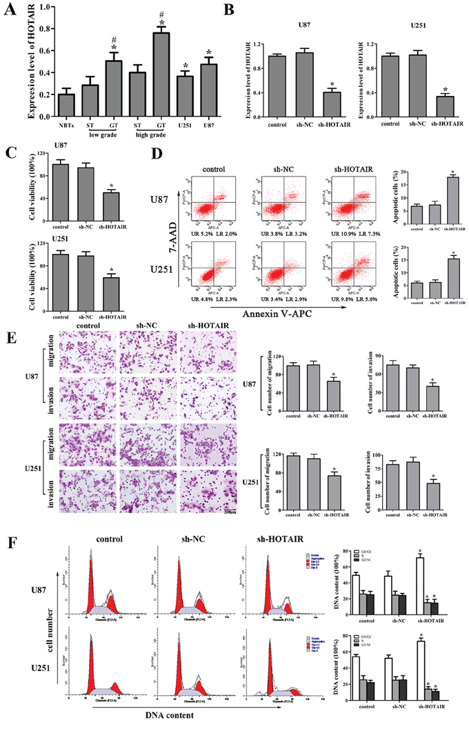 Figure 1: Effect of HOTAIR knockdown in human glioma cell lines. A. HOTAIR expression in normal brain tissues (NBTs), different grades of human glioma tissues (GT), the surrounding non-neoplastic tissues (ST) and U87 and U251 glioma cell lines. Data are presented as the mean ± SD (n = 3, each group). *P < 0.01 vs. NBTs group. #P < 0.05 vs. ST group. B. Relative expression of HOTAIR after cells transfected with short-hairpin RNA plasmids of HOTAIR. Data are presented as the mean ± SD (n = 5, each group). *P < 0.05 vs. sh-NC group. C. Effect of sh-HOTAIR on cell proliferation of U87 and U251 cells. D. Effect of sh-HOTAIR on apoptosis of U87 and U251 cells. E. Effect of sh-HOTAIR on cell migration and invasion of U87 and U251 cells. Scale bars represent 200 μm. F. Effect of sh-HOTAIR on cell cycle of U87 and U251 cells. Data are presented as the mean ± SD (n = 5, each group). *P < 0.05 vs. sh-NC group.