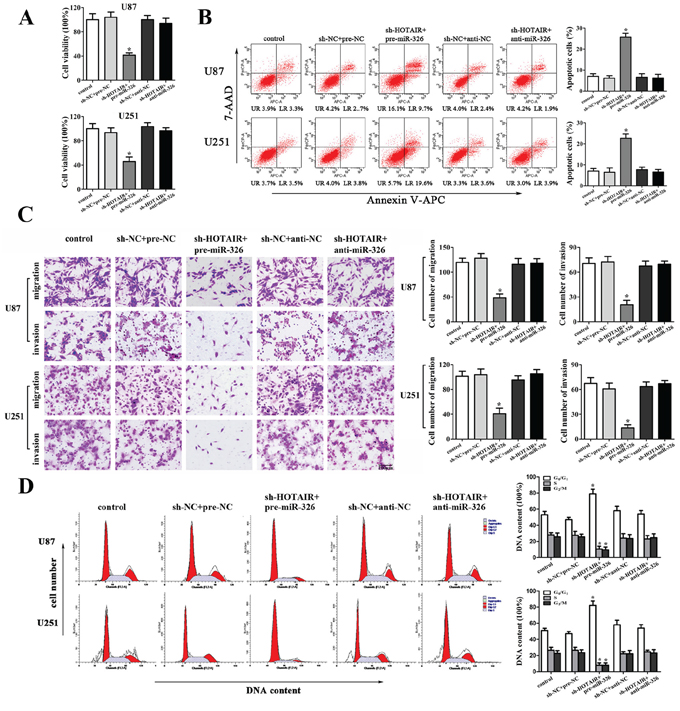 Figure 3: MiR-326 mediated the tumor-suppressive effects of HOTAIR knockdown on glioma cell lines. A. CCK8 assay to evaluate the effect of HOTAIR and miR-326 on cell proliferation in U87 and U251 cells. B. Flow cytometry analysis to evaluate the effect of HOTAIR and miR-326 on cell apoptosis in U87 and U251 cells. C. Quantification of cells to evaluate the effect of HOTAIR and miR-326 on cell migration and invasion in U87 and U251 cells. Scale bars represent 200 μm. D. Flow cytometry analysis to evaluate the effect of HOTAIR and miR-326 on cell cycle in U87 and U251 cells. Data are presented as the mean ± SD (n = 5, each group). *P < 0.05 vs. sh-NC + pre-NC group.