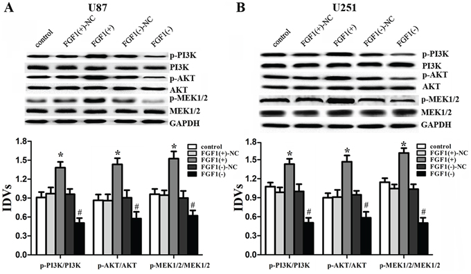 Figure 7: FGF1 activated the PI3K/AKT and MEK1/2 signal pathways. Western blot analysis of the PI3K/AKT and MEK 1/2 pathways regulated by FGF1 in U87 A. and U251 B. cells. Data are presented as the mean ± SD (n = 5, each group). *P < 0.05 vs. FGF1(+)-NC group, #P < 0.05 vs. FGF1(-)-NC group.