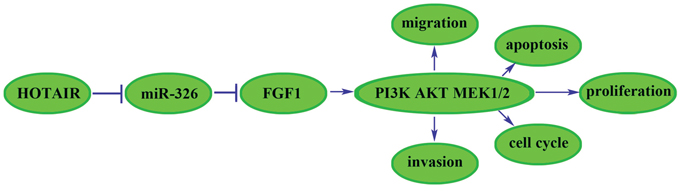 Figure 9: The cartoon of the mechanism underlying the HOTAIR-miR-326-FGF1 axis in U87 and U251 cells.