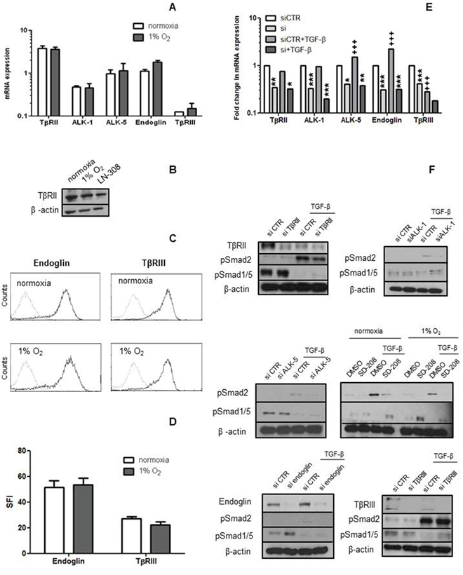 Figure 1: hCMEC express TGF-β receptors and coreceptors. A–D. The levels of mRNA for TGF-β receptors RII, ALK-1, ALK-5 and endoglin or RIII were assessed by RT-PCR (A) and protein by immunoblot (B) or flow cytometry (C, D) as feasible under normoxia and hypoxia. Data in A are expressed as mean values and SD (n = 4). E, F. TGF-β receptor gene silencing was verified on mRNA (n = 3) and protein level. In F, the effect of TGF-β receptor gene silencing on constitutive and TGF-β (10 ng/ml, 72 h)-evoked pSmad2 and pSmad1/5 levels was studied by immunoblot. SD-208 (1 μM, 72 h) was included to confirm the ALK-5 findings (n = 3). (*p < 0.05, **p < 0.01, ***p < 0.001, one-way ANOVA followed by Tukey’s post hoc test, effect of specific siRNA, +++p < 0.001, effect of TGF-β).