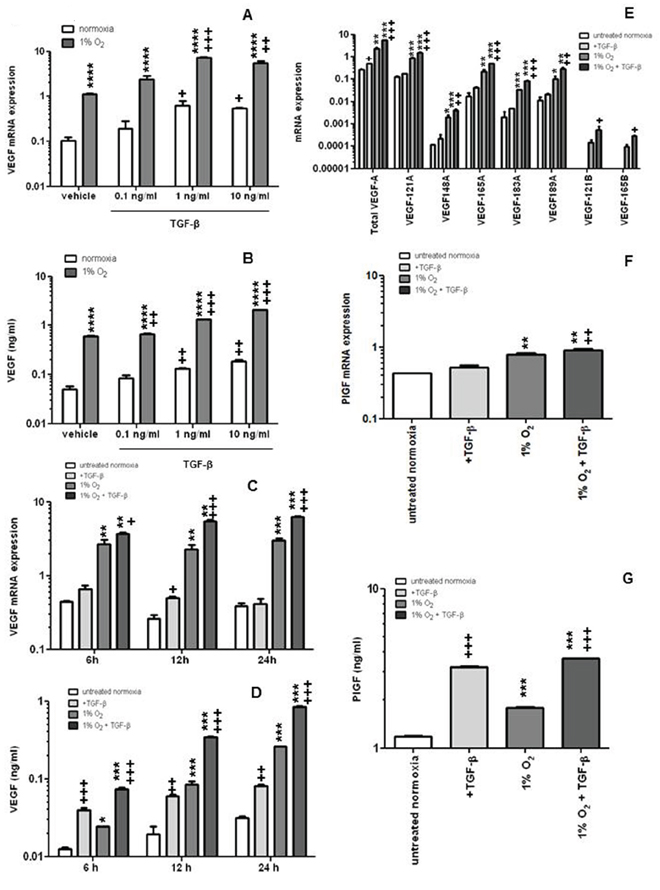 Figure 2: TGF-β induces VEGF and PlGF release by endothelial cells. A, B. hCMEC were seeded in full medium, serum-starved for 24 h, and then cultured in the absence or presence of TGF-β at the indicated concentrations in normoxia or hypoxia and assessed for VEGF mRNA expression by qRT-PCR at 12 h (A) or VEGF protein concentrations in the supernatant by ELISA at 24 h (B) C, D. Similar experiments as in A, B were performed to assess the time dependency of VEGF modulation by TGF-β. E, F. The expression of VEGF isoforms (E) or PlGF (F) mRNA was investigated by qRT-PCR (VEGFXXXA, proangiogenic isoforms, VEGFXXXB, weakly angiogenic isoforms). G. PlGF concentrations in the supernatant were analyzed by ELISA. Data are expressed as mean and SD (n = 3) (*p < 0.05, **p < 0.01, ***p < 0.001, ****p < 0.0001, one-way ANOVA followed by Tukey’s post hoc test, hypoxia versus normoxia, +p < 0.05, ++p < 0.01, +++p < 0.001, one-way ANOVA followed by Tukey’s post hoc test, effect of TGF-β).