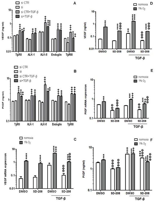 Figure 3: TGF-β-mediated induction of VEGF in endothelial cells involves RII, ALK-5 and RIII. A. The effect of TGF-β receptor gene silencing on constitutive or TGF-β-evoked VEGF release was assessed by ELISA at 72 h (*p < 0.05, **p < 0.01, ***p < 0.001, one way ANOVA followed by Tukey’s post hoc test, effect of specific siRNA, +p < 0.05, ++p < 0.01, +++p < 0.001, effect of TGF-β). B. The effect of TGF-β receptor gene silencing on constitutive or TGF-β-evoked PlGF release was assessed by ELISA at 72 h (*p < 0.05, **p < 0.01, ***p < 0.001, effect of specific siRNA, ++p < 0.01, +++p < 0.001, effect of TGF-β). C–F. The modulation of constitutive or TGF-β-evoked VEGF (C, D) or PlGF (E, F) mRNA expression (C, E) or protein release (D, F) by hypoxia or SD-208 or both was determined by RT-PCR or ELISA. Data are expressed as mean and SD (n = 3). (*p < 0.05, *p < 0.01, ***p < 0.001, two-way ANOVA, hypoxia versus normoxia, +p < 0.05, ++p < 0.01, +++p < 0.001, one-way ANOVA followed by Tukey’s post hoc test, effect of TGF-β, ΦΦΦ p < 0.001, one-way ANOVA followed by Tukey’s post hoc test, effect of SD-208).