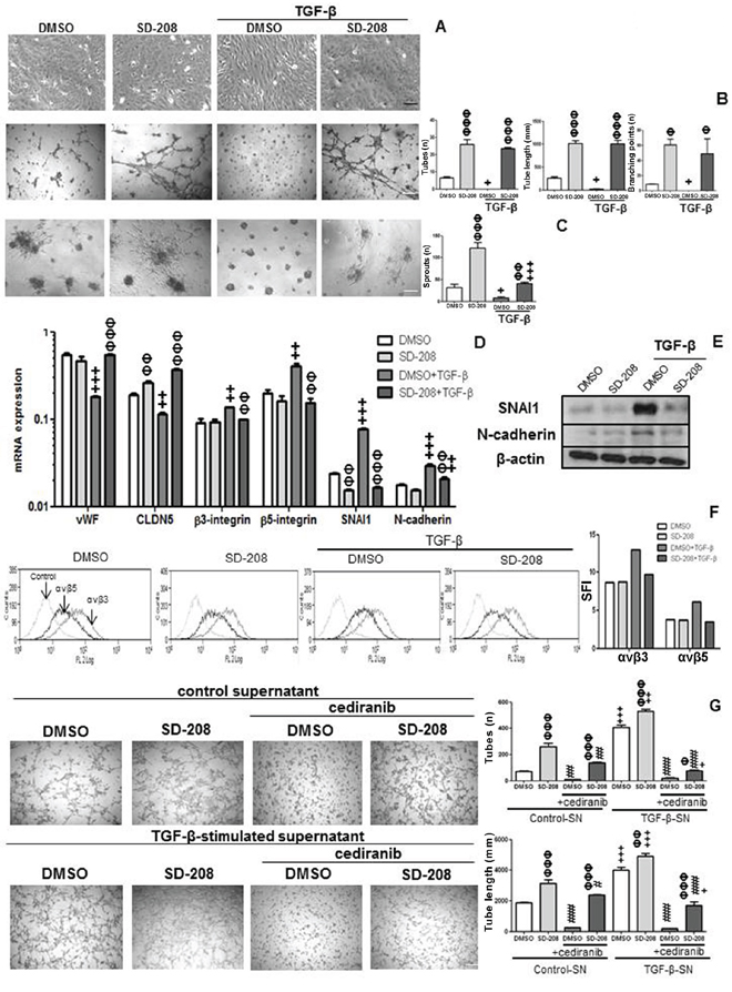 Figure 4: TGF-β induces EndMT in hCMEC and TGF-β-stimulated hCMEC supernatant increases tube formation. A. hCMEC were seeded in full medium, treated with TGF-β (10 ng/ml) or SD-208 (1 μM) for 96 h, and examined by phase contrast microscopy. B. Tube formation was quantified by assessing the number of tubes (n), tube length (mm) and number of branching points (n). C. Endothelial cell sprouting was assessed by counting numbers of sprouts (n). D. mRNA expression of vWF, CLDN5, β3 and β5 integrins, SNAI1 and N-cadherin was assessed by qRT-PCR under the same conditions as in A, for 72 h. Data are expressed as mean and SD (n = 3) (+p < 0.05, ++p < 0.01, +++p < 0.001, one-way ANOVA followed by Tukey’s post hoc test, effect of TGF-β, ΦΦ p < 0.01, ΦΦΦ p < 0.001, effect of SD-208). E. Protein levels of SNAI1 and N-cadherin were assessed by immunoblot under the same conditions as A at 96 h. F. Protein levels of αvβ3 and αvβ5 was assessed by flow cytometry under the same conditions as in A, at 96 h. G. hCMEC supernatant treated with TGF-β for 96 h was concentrated and added with or without cediranib (1 μM) to hCMEC pretreated with DMSO or 1 μM SD-208 for 1 h. Tube formation was assessed after 12 h, by determining the number of tubes and tube length. Data are expressed as mean and SD (n = 3) (ΦΦ p < 0.01, ΦΦΦ p < 0.001, one-way ANOVA followed by Tukey’s post hoc test, effect of SD-208, +p < 0.05, ++p < 0.01, +++p < 0.001, effect of TGF-β-stimulated supernatant, #p < 0.05, ###p < 0.001, effect of cediranib).