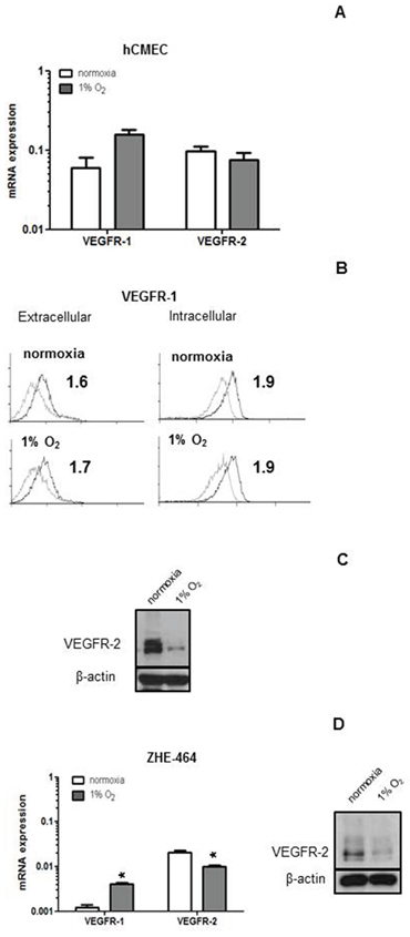 Figure 5: Modulation of VEGFR expression by hypoxia in hCMEC and GMEC. A. VEGFR-1 or VEGFR-2 mRNA expression were assessed under normoxia or 24 h of hypoxia by qRT-PCR. B. Basal levels of extracellular or intracellular VEGFR-1 protein were assessed by flow cytometry under normoxia or hypoxia, SFI are indicated. C. VEGFR-2 levels of hCMEC were assessed by immunoblot. D. Similar experiments as in A and C were performed in ZHE-464. Data are expressed as mean and SD (n = 3). (*, effect of hypoxia, student t-test).